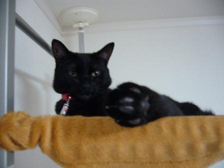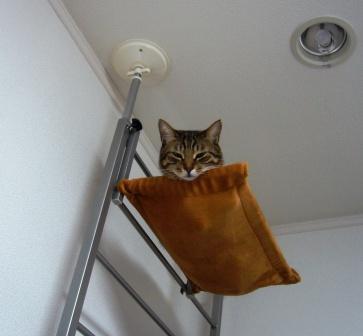 不満顔ですがwキャットタワーの頂上にあるハンモックで寝ております。