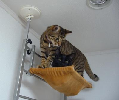 キャットタワー上部のハンモックにキュウキュウになりながら二匹で入ってるのを見て