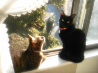 窓辺で日光浴中のアリスさんとまぐろちゃん。